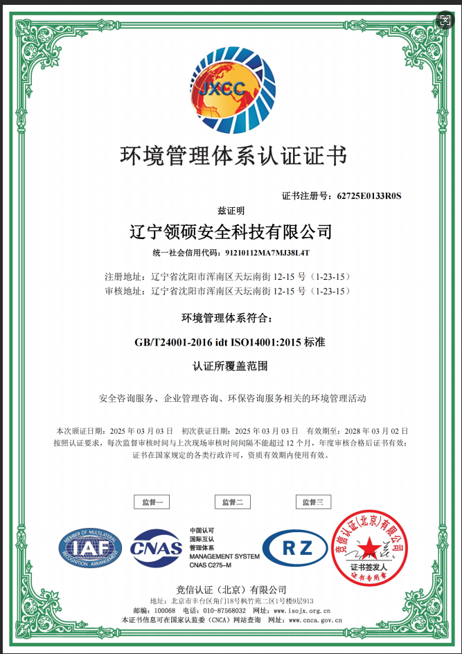 遼寧領碩安全科技有限公司位于遼寧省沈陽市渾南區天壇南街12-15號,注冊資金300萬。主要經營范圍為遼寧省范圍內的安全環保咨詢,生產安全事故應急預案技術服務、企業雙重預防機制建立、履職能力評估、企業科研項目安全部分服務等的技術服務機構。現有員工12人,其中包括5名遼寧省級安全生產專家。成立于2022年4月18日,在盤錦市成立至今已經為30余家企業提供了安全環保技術咨詢。 業務范圍包括:技術服務、技術開發、技術咨詢、技術交流、技術轉讓、技術推廣,安全咨詢服務,環保咨詢服務,標準化服務,企業管理咨詢,科技中介服務,工程管理服務,特種作業...查看更多